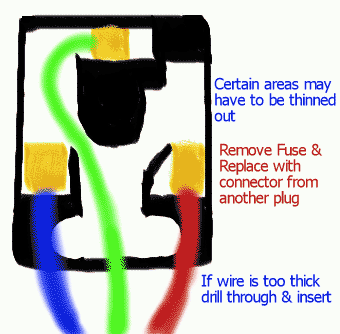 My power cord is only 1.6 m long, so that leaves 0.4 m to be used as biwire jumpers. Some surgery has to be done to the IEC connector to enable the CS-122 leads to enter. From my old hobby of building scale models, I have an X-Acto handle saw, a motor drill with engraving bits etc if I really wanted to make a neat cut, but for this, I just took a wire cutter and ripped a new hole. :) Inside, wrap the wires round the screws. The cable was a bit thick so I cut a tiny bit off to make it easier to wrap around. Major surgery has to be done to the 3 pin plug. Why don't we have the plugs like the US hubbell plugs which can take enormous cables?